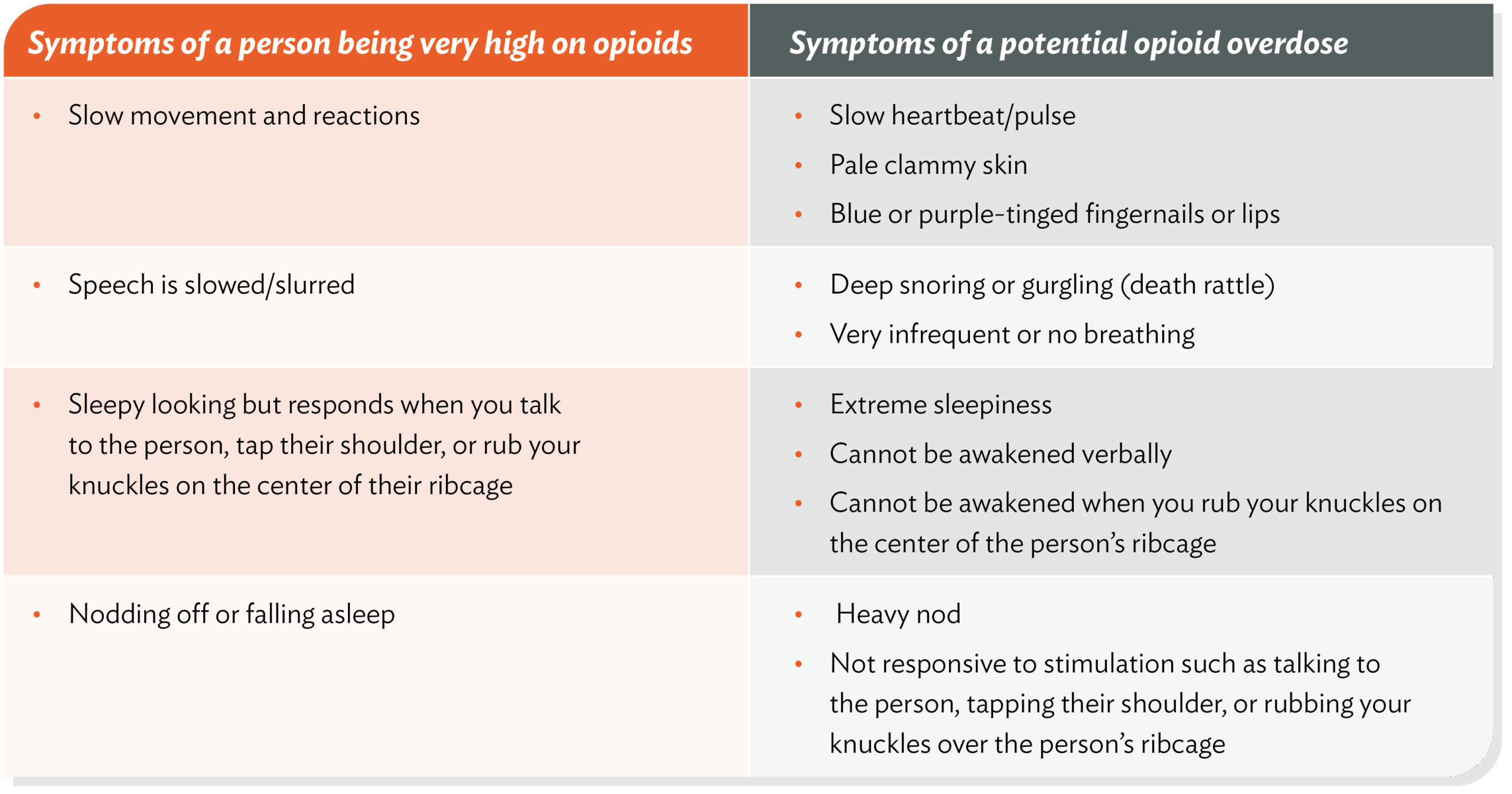 MHFA training teaches you how to recognize and respond to signs and symptoms that may indicate someone is experiencing an opioid overdose. It’s important to recognize the differences between someone who is very high on opioids and someone who may be experiencing an overdose. (See chart.) Differentiating between the two can you know when it is appropriate to call 911 and/or administer naloxone.