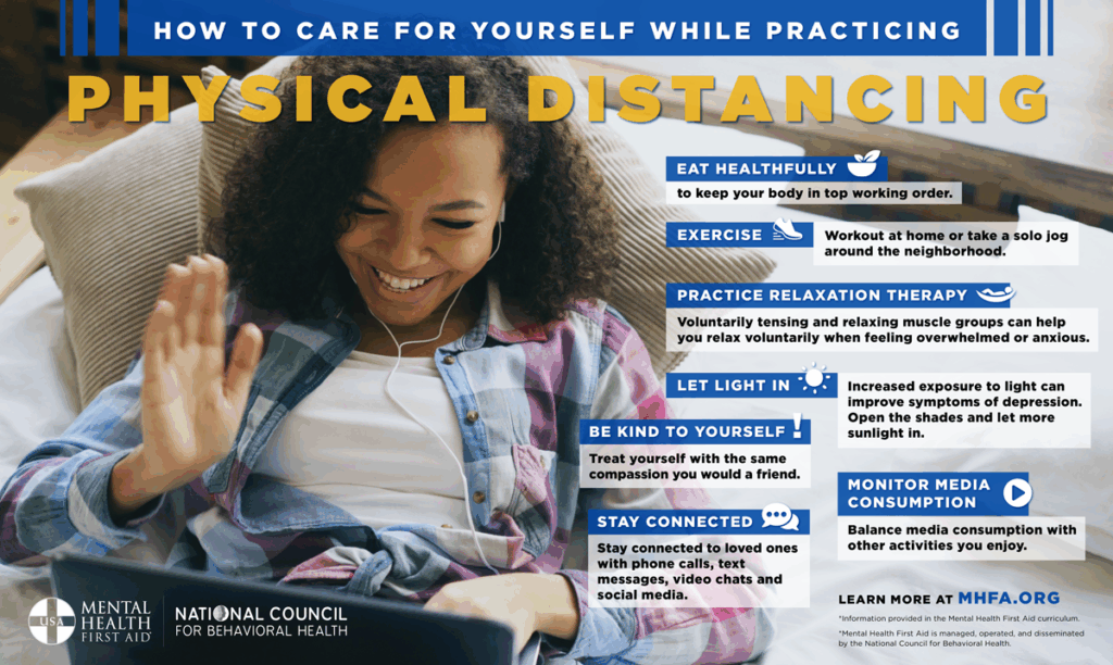 Use these tips from the MHFA curriculum to take care of your mental health while practicing physical distancing.