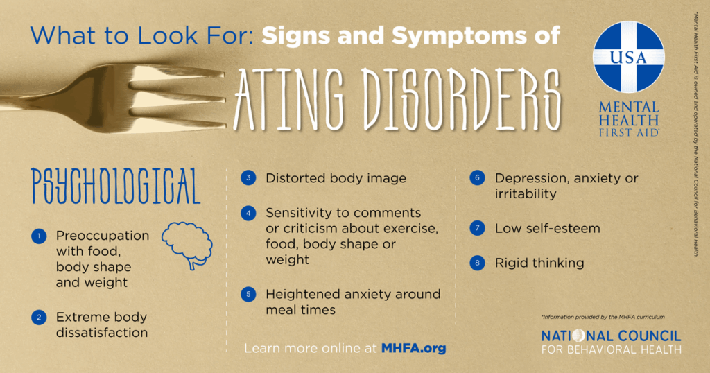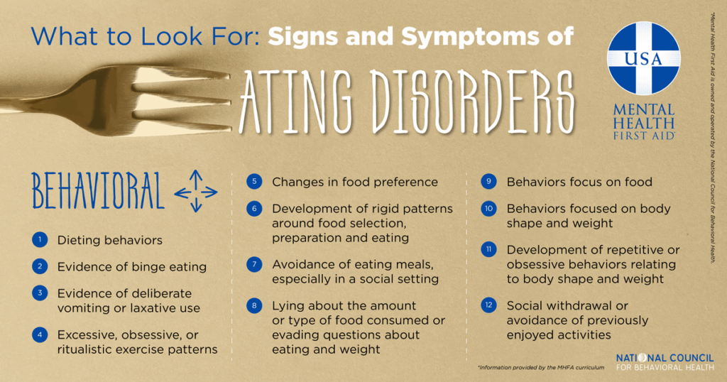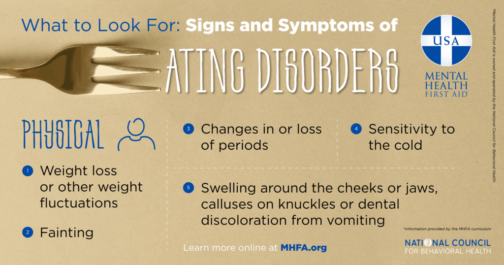 Eating disorders can sometimes be difficult to recognize. A person with an eating disorder might be underweight, overweight or even normal weight. That’s why it’s important to know the signs and symptoms that may indicate someone is struggling: