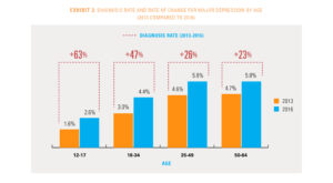 According to the report, a 63 percent increase was observed in depression diagnoses among teenagers, ages 12-17, within three years of the 2013 baseline data from 1.6-2.6 percent. Additionally, the percent of young adults, ages 18-34, diagnosed with depression rose to 4.4 percent in 2016, compared to 3 percent in 2013 – a 47 percent increase.